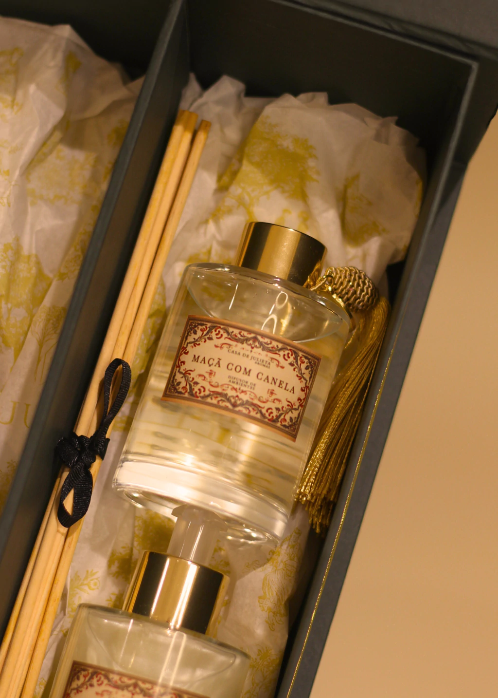 Caixa Acartonada Casa de Julieta com Imagem Sagrada Família e Difusor de Aromas com varetas e Sabonete Líquido Maçã com Canela